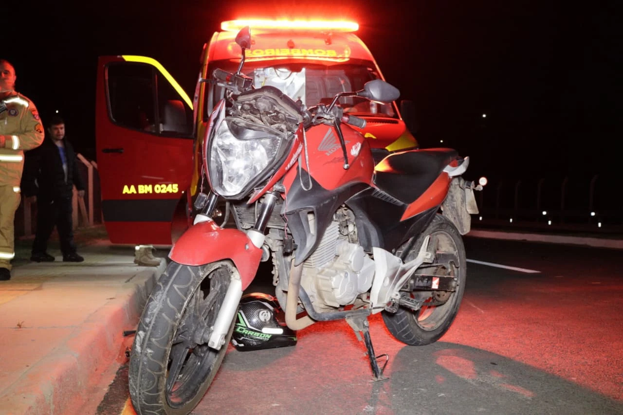 Conforme as autoridades, motociclista de 29 anos conduzia moto Honda CB300r vermelha, no sentido Centro, quando perdeu o controle da direção e sofreu a queda.
