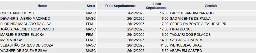 Falecimentos de 25/12/2025