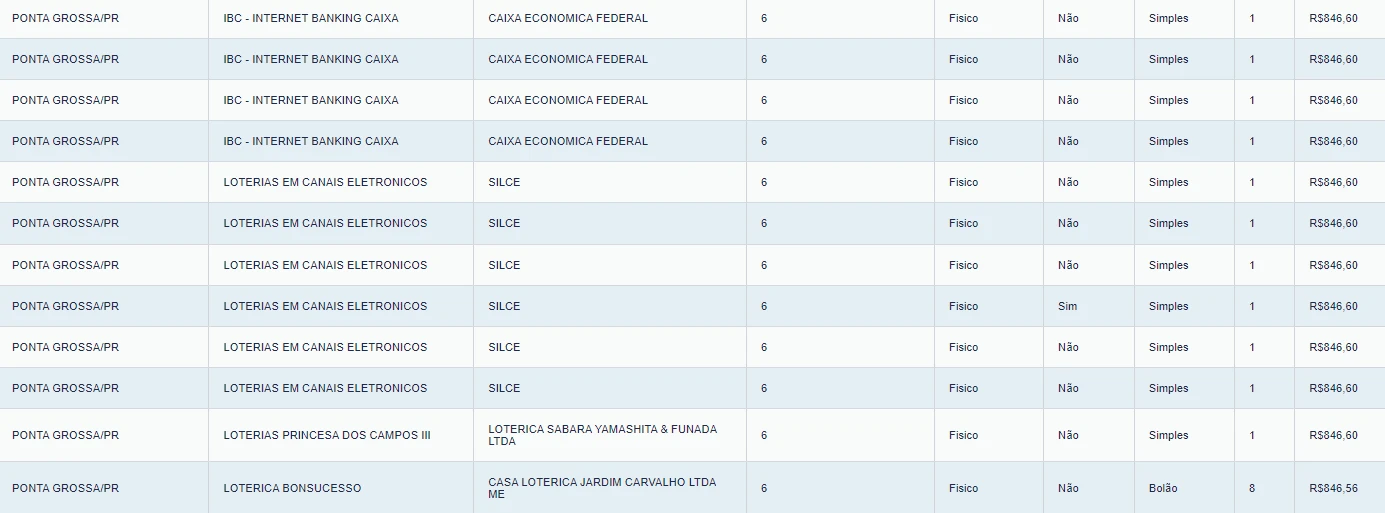 Para o próximo concurso, os apostadores de Ponta Grossa podem registrar suas apostas até as 20h (horário de Brasília) de sábado (28), em lotéricas da cidade ou pelo site e aplicativo da Caixa. A aposta simples, com seis dezenas, custa R$ 6.