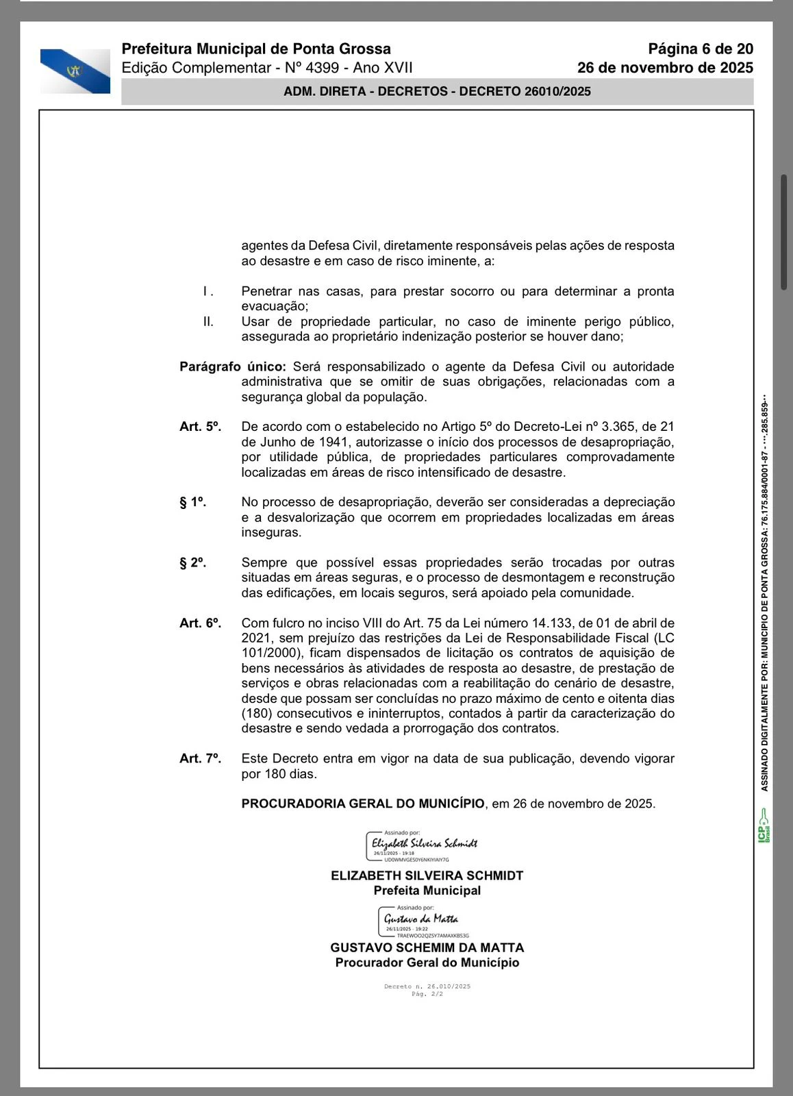 O decreto municipal nº 26.010/2025 também foi homologado pelo Governo do Paraná, por meio do decreto nº 12.060/2025. Ambos têm validade de 180 dias e são ferramentas para autorizar a mobilização emergencial de todos os órgãos da Prefeitura, que passam a atuar sob coordenação da Coordenadoria Municipal de Proteção e Defesa Civil.