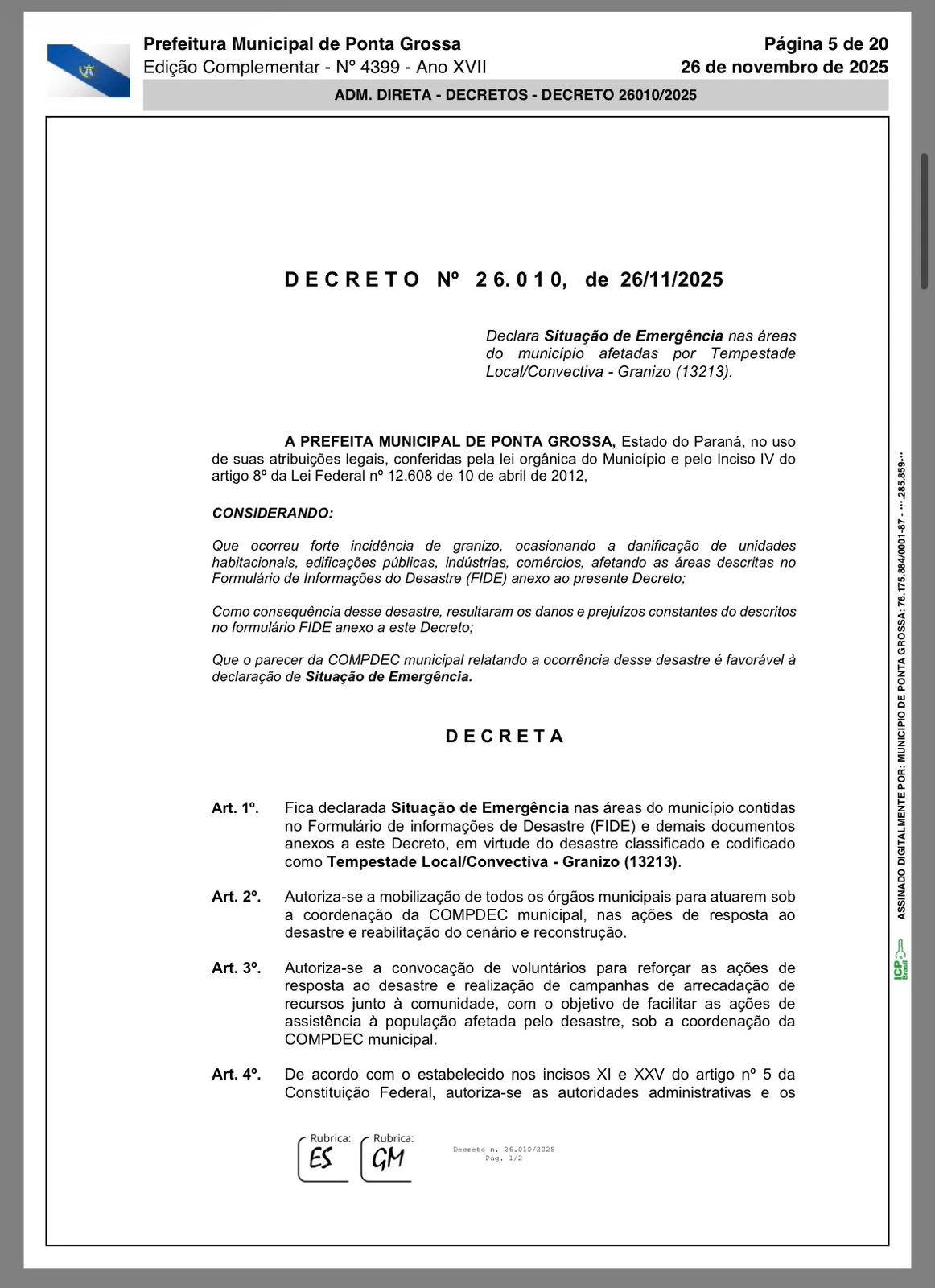 A prefeita Elizabeth Schmidt decretou, nesta quarta-feira (26), Situação de Emergência no município de Ponta Grossa. A medida tem como justificativa os impactos das fortes chuvas de granizo registradas na segunda-feira (24), que atingiram mais de 1.500 famílias na cidade.
