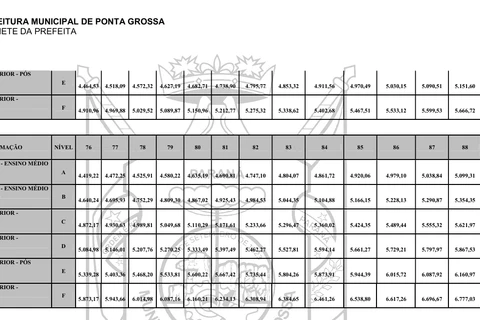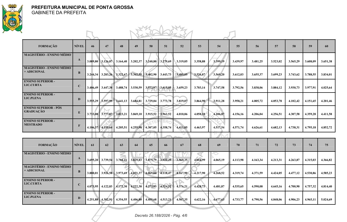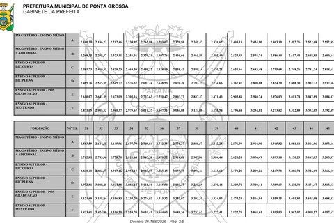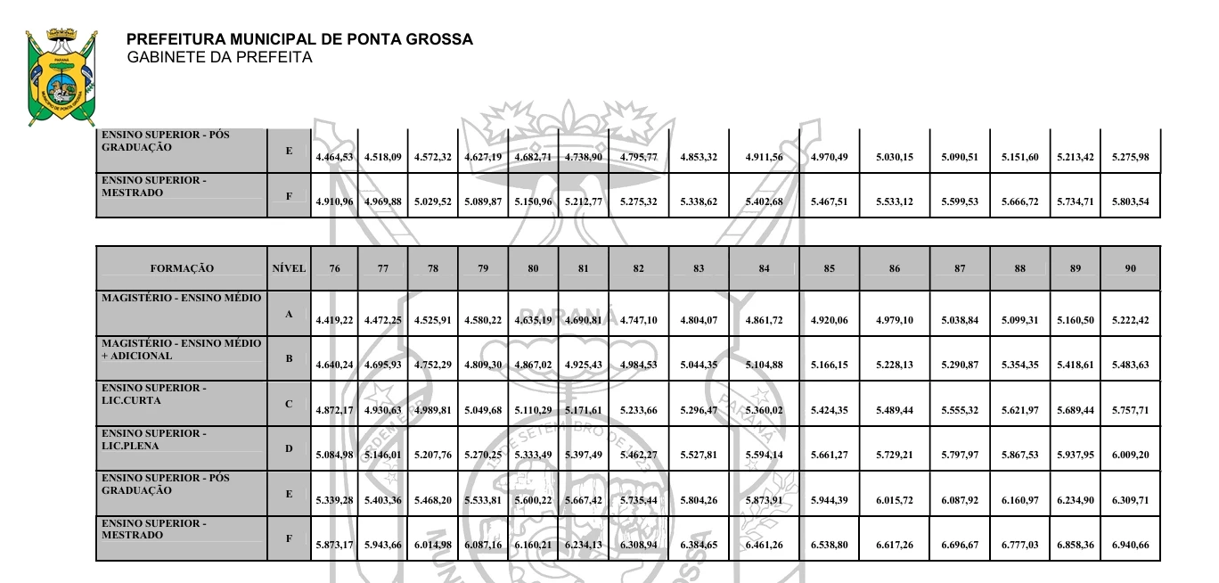 A Prefeitura Municipal de Ponta Grossa oficializou, nesta quarta-feira (14), o reajuste nos vencimentos dos profissionais da Rede Municipal de Ensino. O Decreto nº 26.188, assinado pelo prefeito em exercício Moises Elias Ribas Faria, define um aumento de 0,37% para a categoria.