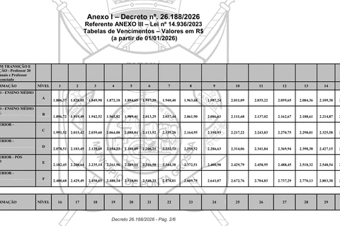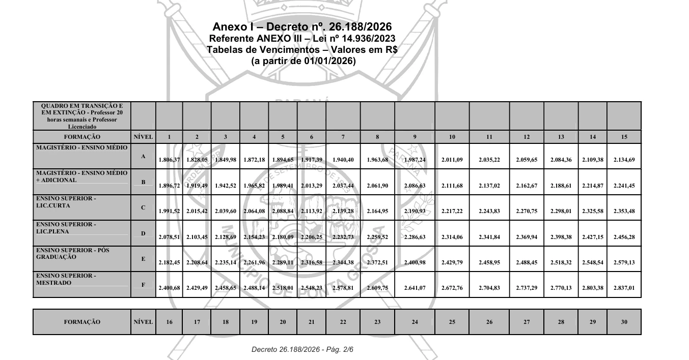 A atualização salarial tem efeito retroativo e vale a partir de 1º de janeiro de 2026. O documento atualiza os anexos III e IV da Lei nº 14.936/2023, que rege o plano de cargos e salários do magistério municipal.