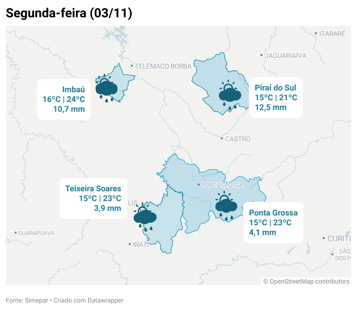 Em Ponta Grossa, a segunda-feira começa com nebulosidade e a chuva pode acontecer a qualquer momento do dia - o acumulado previsto é de 4,1 milímetros. O sol aparece entre nuvens e os termômetros variam entre 15ºC e 23ºC.