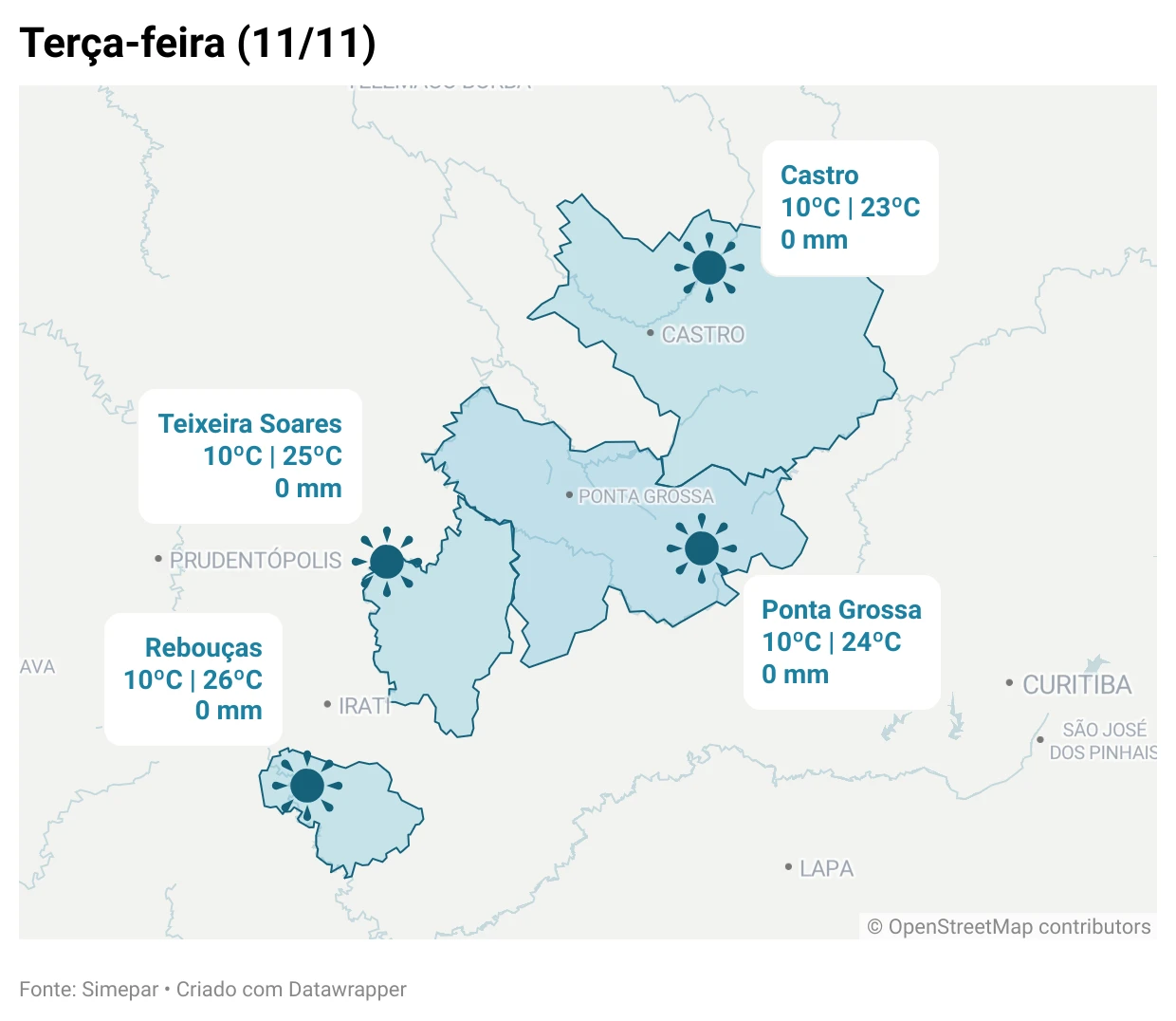 Ponta Grossa e municípios dos Campos Gerais devem ter mais um dia com céu ensolarado, segundo o Sistema de Tecnologia e Monitoramento Ambiental do Paraná (Simepar). A previsão é de uma terça-feira (11) com tempo estável e temperaturas mais altas no período da tarde.