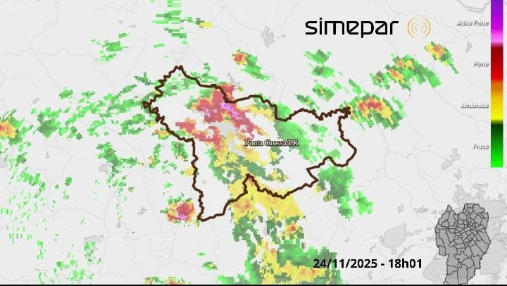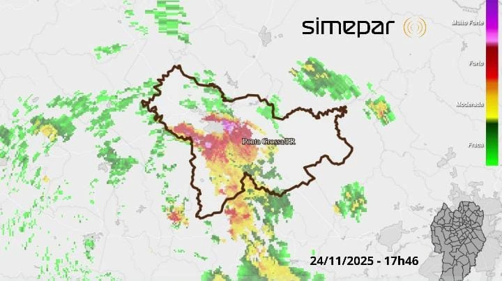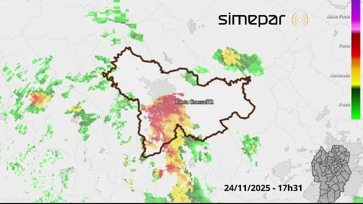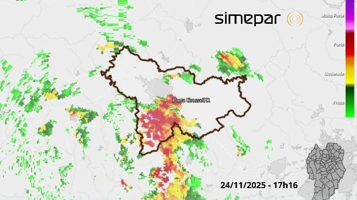 Nas imagens, é possível ver que o temporal se aproxima de Ponta Grossa pela região sul e avança para o Norte. A maior concentração de chuva acontece por volta de 17h40, justamente quando o temporal atingia a área urbana da cidade.