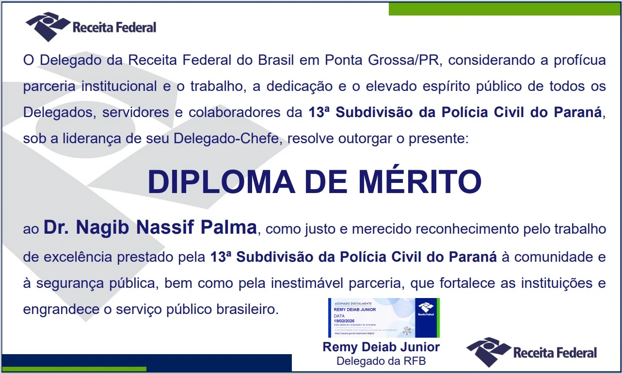 Além da entrega de uma medalha institucional, o Delegado Remy Deiab Junior, representando todos os servidores da RFB, também outorgou um diploma de mérito com o seguinte registro: “O Delegado da Receita Federal do Brasil em Ponta Grossa/PR, considerando a profícua parceria institucional e o trabalho, a dedicação e o elevado espírito público de todos os Delegados, servidores e colaboradores da 13ª Subdivisão da Polícia Civil do Paraná, sob a liderança de seu Delegado-Chefe, resolve outorgar o presente diploma de mérito ao Dr. Nagib Nassif Palma, como justo e merecido reconhecimento pelo trabalho de excelência prestado pela 13ª Subdivisão da Polícia Civil do Paraná à comunidade e à segurança pública, bem como pela inestimável parceria, que fortalece as instituições e engrandece o serviço público brasileiro”.