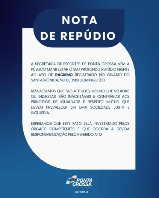 Nesta quinta-feira (17), a Secretaria Municipal de Esportes de Ponta Grossa se manifestou através de uma nota oficial sobre o episódio de racismo, que aconteceu em um ginásio no bairro Santa Mônica, durante uma partida de futsal, no último domingo (13).