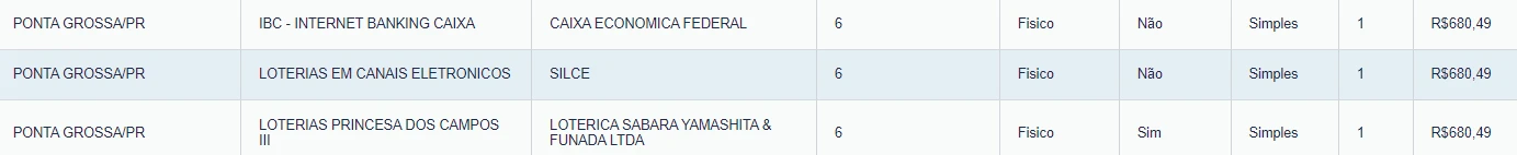 No total, 31 apostas acertaram cinco dezenas e levarão R$ 37.328,03 cada, enquanto 2.803 apostas acertaram quatro dezenas. Entre essas, estão as três de Ponta Grossa. Veja abaixo onde elas foam realizadas: