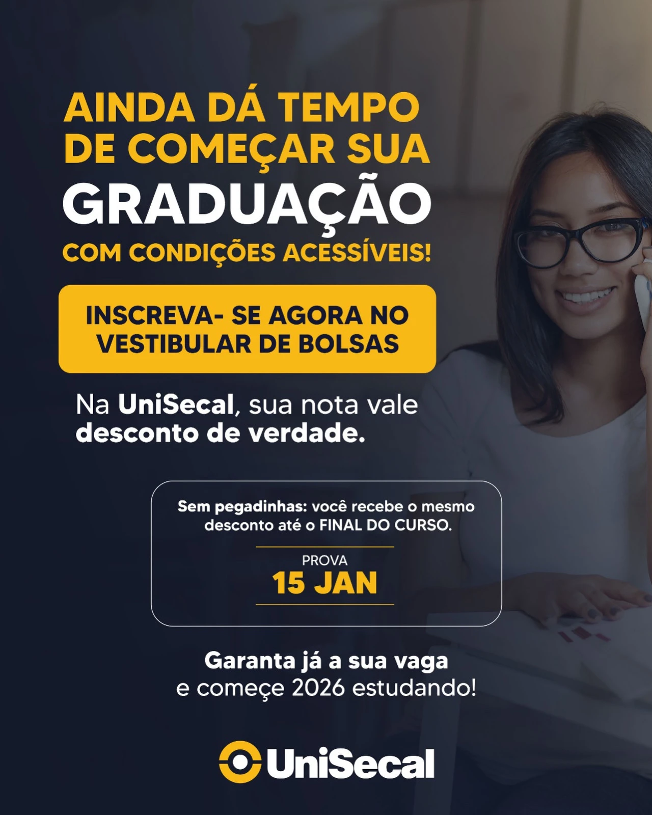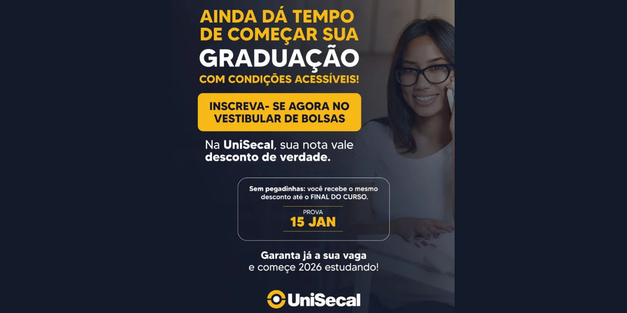 Quem está em busca de uma forma acessível de iniciar a graduação em 2026 tem uma nova oportunidade em Ponta Grossa. A UniSecal promove, no dia 15 de janeiro, às 19h, o Vestibular de Bolsas Presencial, voltado a candidatos que desejam ingressar no ensino superior ainda neste ano.