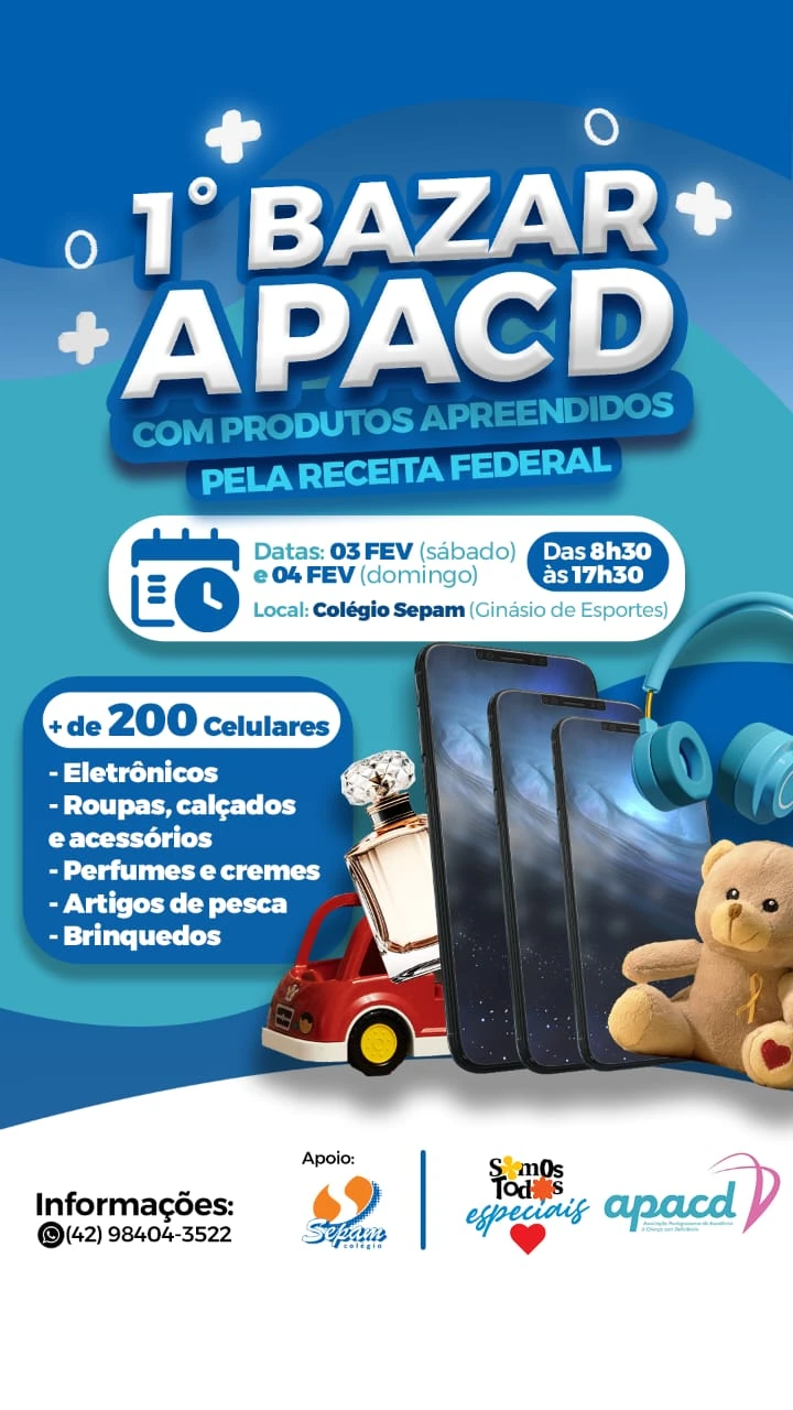 A Associação Pontagrossense de Assistência a Criança com Deficiência realiza nos dias 3 e 4 de fevereiro o 1º Bazar Beneficente APACD. Contando com mais de 600 itens à venda, o evento acontece das 8:30 às 17:30, no Ginásio de Esportes do Colégio Sepam, na Rua Santos Dumont, 1390, esquina com a Rua Francisco Búrzio.