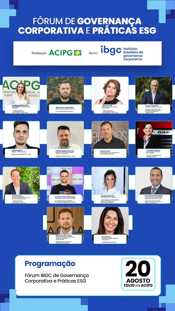 No dia 20 de agosto, a Casa do Empresário sediará a primeira edição do Fórum de Governança Corporativa e Práticas ESG, uma iniciativa da ACIPG apoiada pelo IBGC - Instituto Brasileiro de Governança Corporativa. A programação inclui palestras de especialistas renomados e painéis de discussão que proporcionarão uma plataforma para debates ricos e construtivos sobre o futuro das práticas sustentáveis e responsáveis.