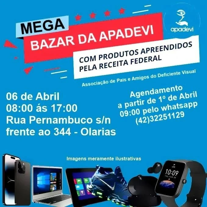 No sábado (06), a Apadevi realizará um bazar com produtos apreendidos pela Receita Federal, das 8h às 17h, na R. Pernambuco, s/n em frente ao 344 - Olarias. Os interessados em participar do bazar precisam realizar um agendamento prévio com a instituição, através do telefone: (42) 3225-1129.