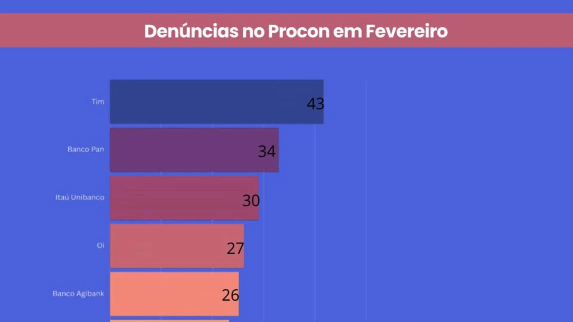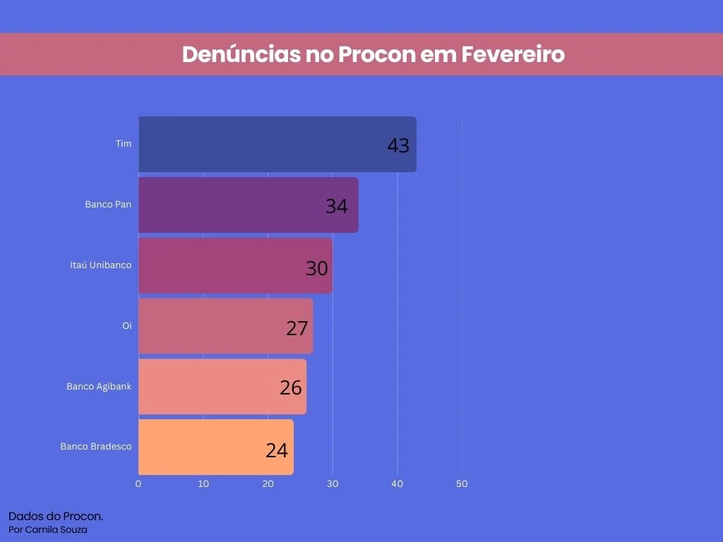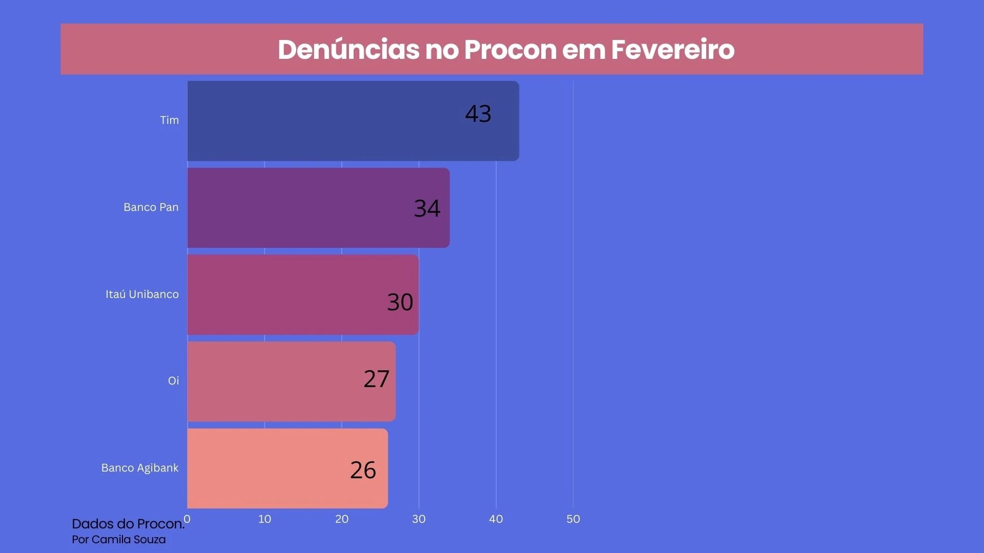 Das dez empresas, mapeamos quais são as cinco que mais possuem reclamações junto ao órgão. No mês de janeiro, a Tim (42 denúncias) e a Oi (35 denúncias), ambas empresas de telefonia, ficaram em primeiro e segundo lugar, respectivamente. Em terceiro ficou a Sanepar com 33 denúncias, já os Bancos BMG (26) e o Bradesco (19), fecham o ranking de denúncias. Já no mês de fevereiro, a Tim continua na liderança, com 43 denúncias. Seguido por Banco Pan (34 denúncias), Itaú Unibanco (30 denúncias), Oi (27 denúncias) e Banco Agibank, em quinto lugar com 26 denúncias.