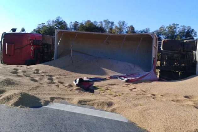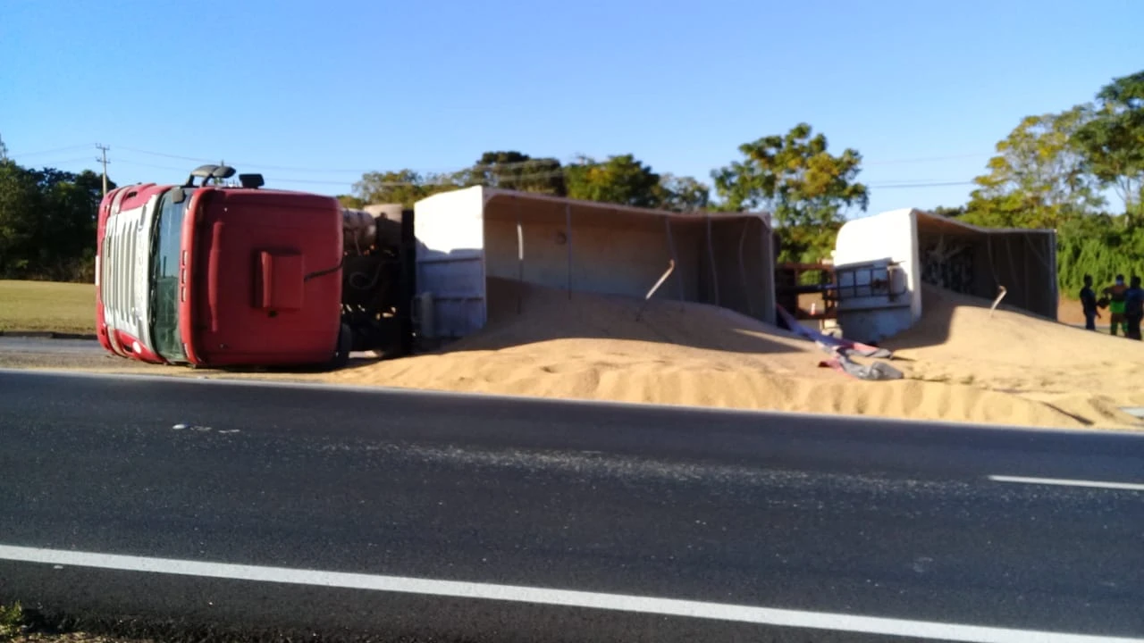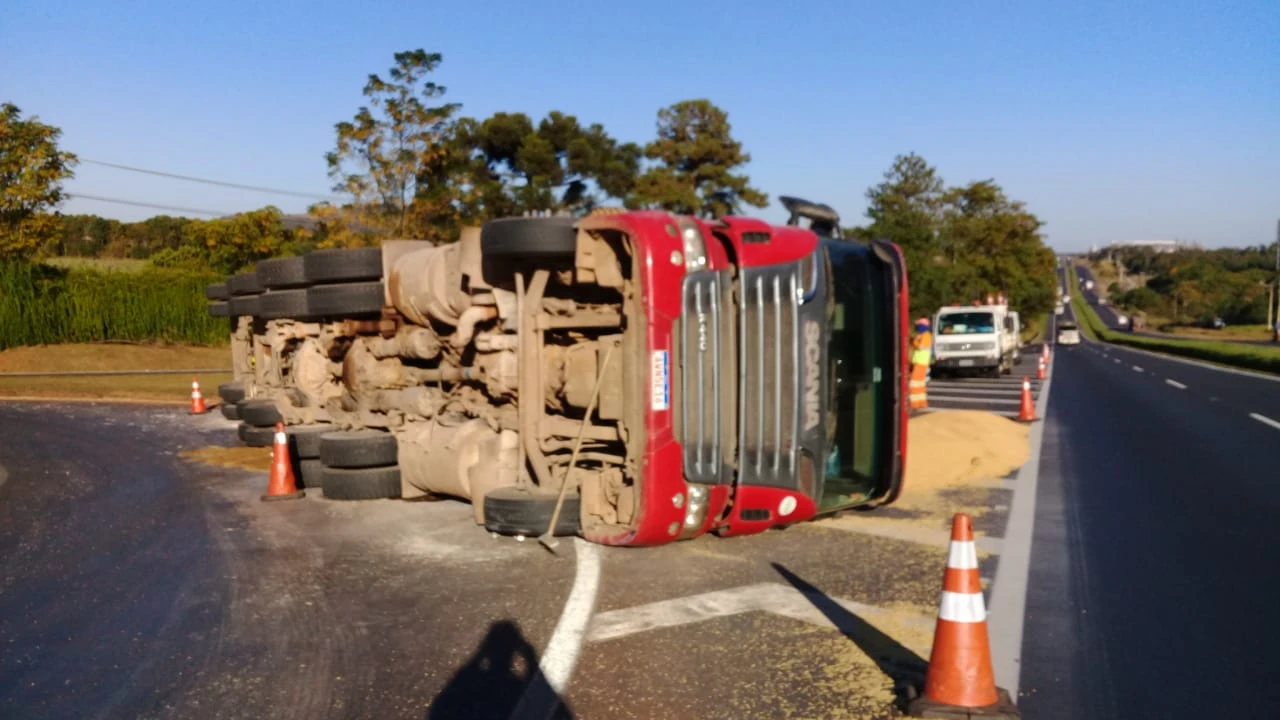 Na tarde desta quinta-feira (23), um caminhão bi-trem tombou na alça de acesso para a BR-376, no sentido Ponta Grossa.