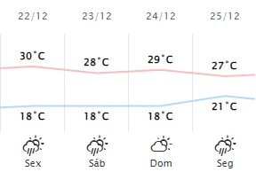 Já no domingo (24), véspera de Natal, o céu terá muitas nuvens e a temperatura varia entre 29 e 18ºC. No Natal, o clima volta a ficar nublado e com possibilidade de pancadas de chuva com temperatura variando entre 27 e 21ºC.