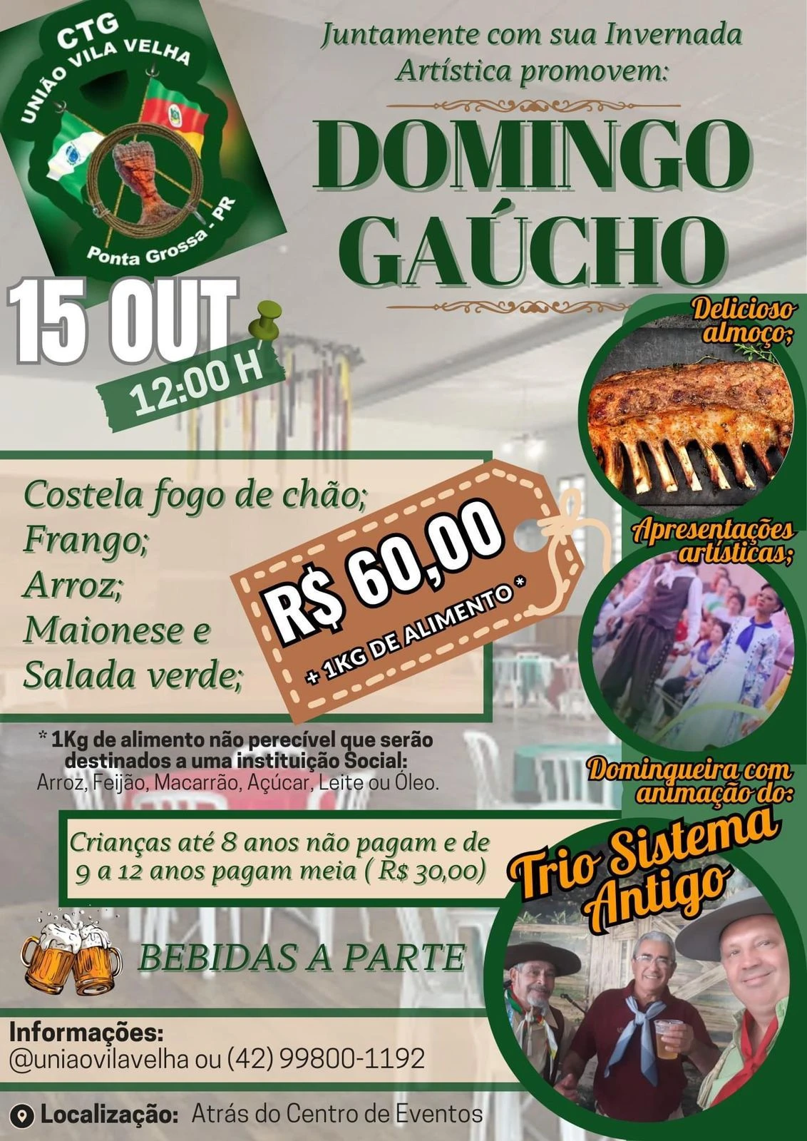 No próximo dia 15, o CTG União Vila Velha realiza, a partir das 12:30, o Domingo Gaúcho. O evento será promovido em prol da Invernada Artística, que busca recursos para representar Ponta Grossa no FEPART a ser realizado no fim do ano em Foz do Iguaçu. Além de apresentações artísticas, o Domingo Gaúcho terá almoço com costela fogo de chão, frango, arroz, maionese e salada verde. O custo do ingresso é de R$ 60 mais um quilo de alimento não perecível, que será destinado a uma instituição social. Crianças com idade até 8 anos não pagam. Já aquelas que tiverem entre 9 e 12 anos pagam meia (R$ 30). O consumo de bebidas é à parte.
