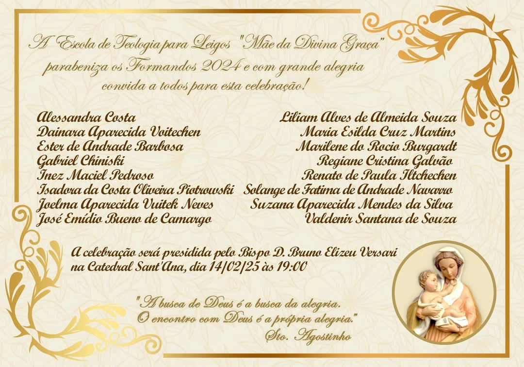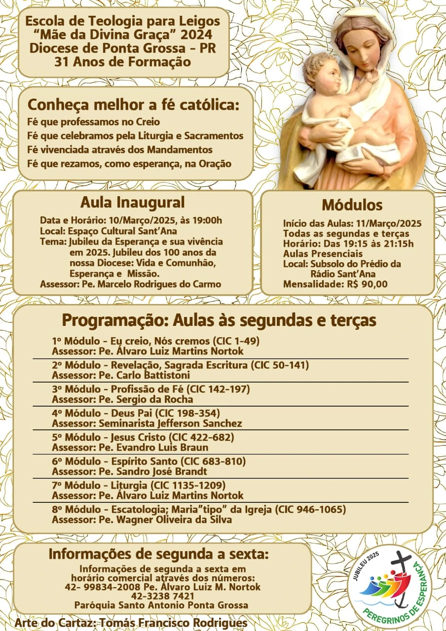 Na noite desta sexta-feira (14), às 19 horas, na Catedral Sant'Ana, o bispo Dom Bruno Elizeu Versari presidirá a celebração que marcará a formatura dos 16 alunos da Escola de Teologia para Leigos Mãe da Divina Graça. Com 31 anos de fundação, a Escola auxilia os católicos a conhecer melhor a sua fé, baseando-se no Catecismo da Igreja Católica e na Bíblia, com o conteúdo dividido por 16 módulos, desenvolvidos em dois anos. São aprofundados temas como a 'fé que professamos no Creio', a 'fé que celebramos pela Liturgia e Sacramentos', a 'fé vivenciada através dos mandamentos' e a 'fé que rezamos, como esperança, na oração'.