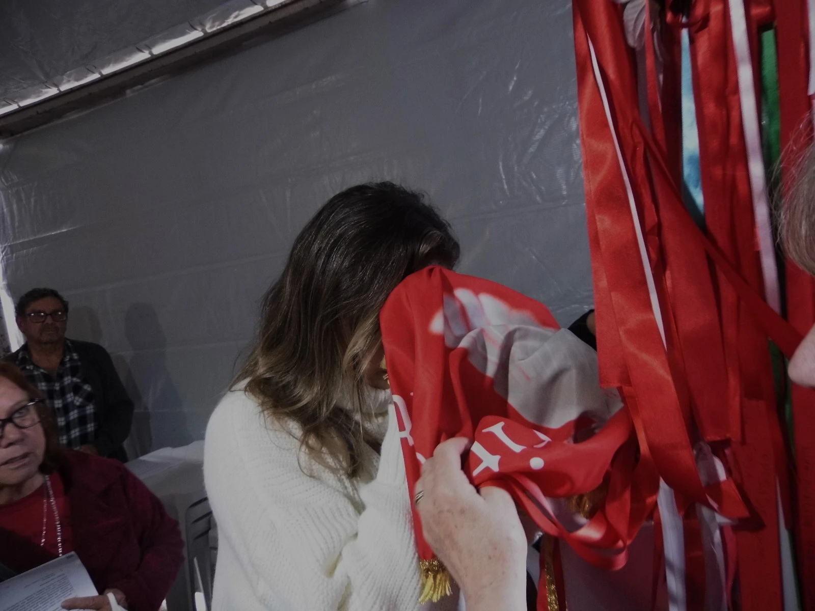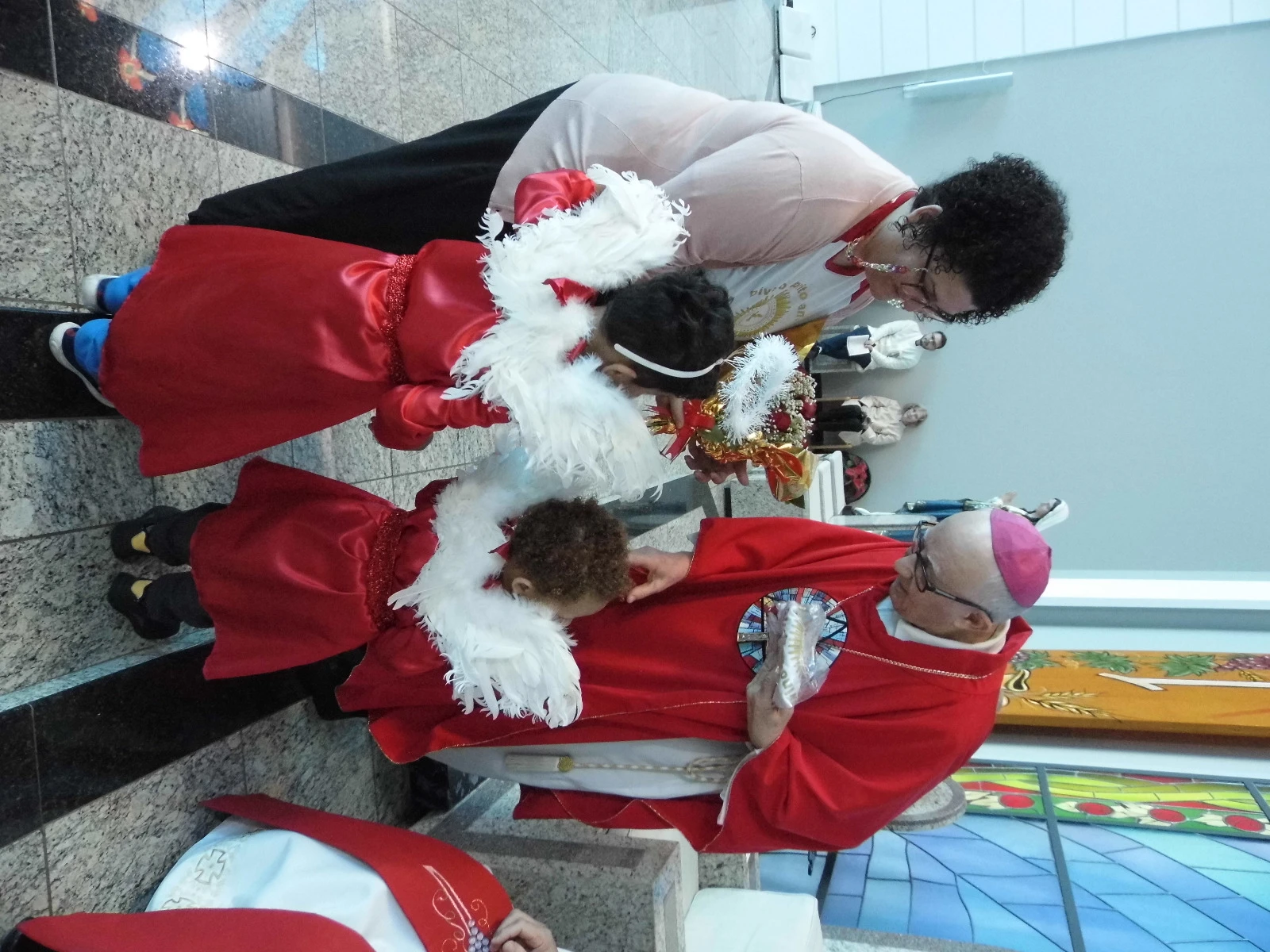 Lídia Hoffmann Chaves, coordenadora da Casa do Divino, agradeceu a todos, entregando ao bispo Dom Sergio um buquê de flores e uma camiseta com estampa da Casa do Divino e outra com a estampa da Catedral. "Queremos expressar todo o carinho ao nosso bispo, que vai deixar este ano o trabalho de pastoreio da Diocese, mas, que, esperamos, ainda fique conosco. Ano que vem contamos com a sua presença. Gostaria que o senhor mostrasse os presentes, muito simples, mas que lembram que o senhor vestiu sempre a camisa da Casa do Divino e da Catedral", enalteceu Lídia, citando que a Casa do Divino de Ponta Grossa é a única do Paraná. Ela fica a duas quadras da Catedral, no centro da cidade. "Ainda pouca gente conhece. Uma casa que foi fundada em 1882 e que é patrimônio histórico cultural tombado, não só o imóvel, mas a cultura e a devoção ao Divino Espírito Santo", explicou.