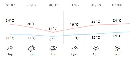 Em Ponta Grossa, a previsão é de 6 milímetros de chuva na segunda-feira (29), com temperaturas entre 11ºC e 20ºC. Na terça (30), deve chover bem menos, cerca de 1 milímetro apenas, porém as temperaturas caem para 9ºC de mínima e 19ºC de máxima. Na quarta-feira (31), o tempo fica nublado, com variação de 11ºC e 19ºC de máxima. Já na quinta (1º) e na sexta (2), o sol deve retornar ao município: as mínimas ficam entre 12ºC e 14ºC e as máximas entre 23ºC e 24ºC.