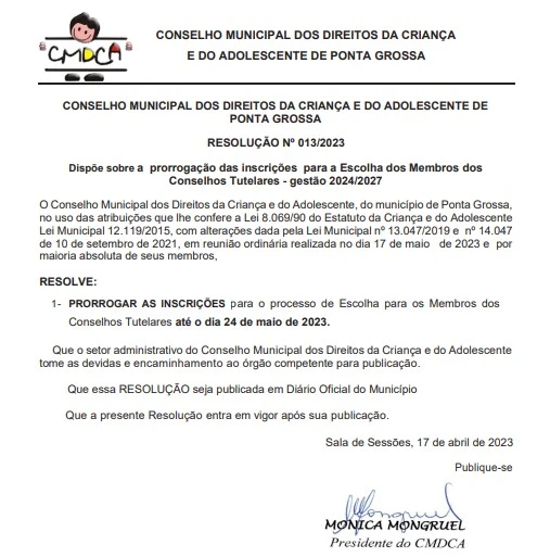 O Conselho Municipal dos Direitos da Criança e do Adolescente (CMDCA) de Ponta Grossa prorrogou para o dia 24 de maio as inscrições para o processo de escolha de 15 novos membros do Conselho Tutelar. A informação consta no Diário Oficial publicado nesta quinta-feira (18).