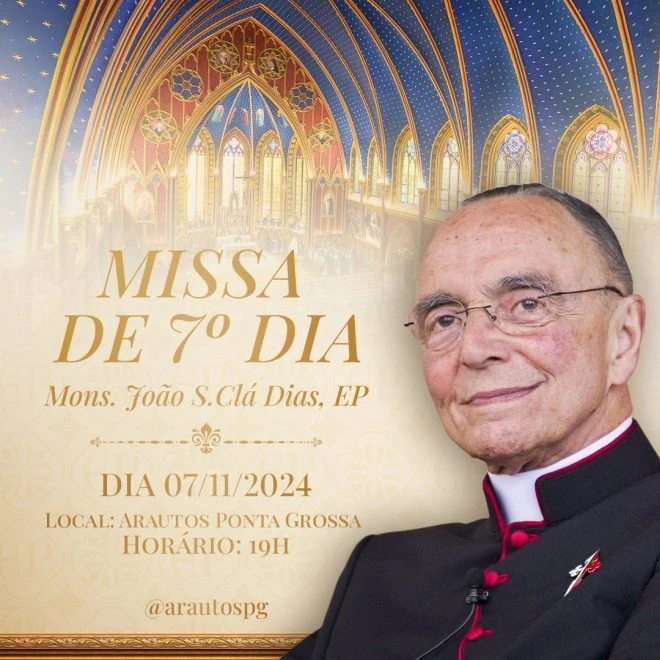 Nesta quinta-feira (7), será realizada a missa de sétimo dia do João Scognamiglio Clá Dias, às 19h, nos Arautos do Evangelho de Ponta Grossa. Ele faleceu na sexta-feira (1º), aos 85 anos, após passar mais de 10 anos enfrentando sequelas de um AVC.