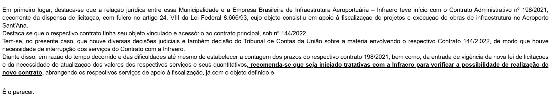 A Procuradoria recomenda que o município inicie novas tratativas com a Infraero para um novo contrato, adaptado à nova Lei de Licitações. O parecer aponta dificuldades no cálculo de prazos e na atualização de valores e quantitativos. Também ressaltou as limitações no acesso a processos administrativos sigilosos, como o SEI 02071/2023, o que dificulta a transparência das decisões recentes.