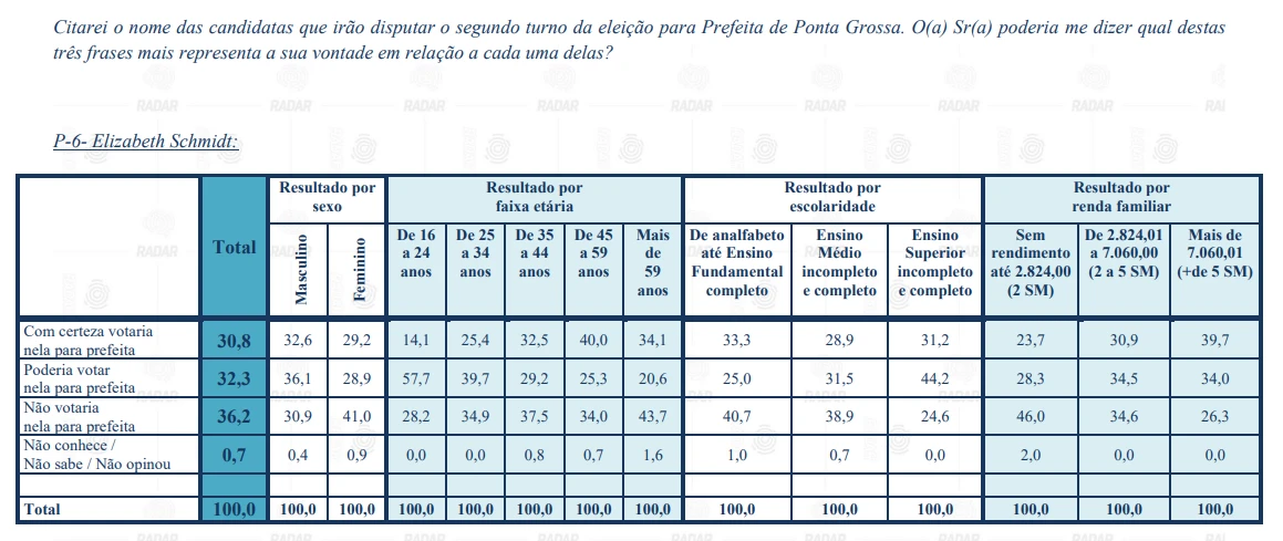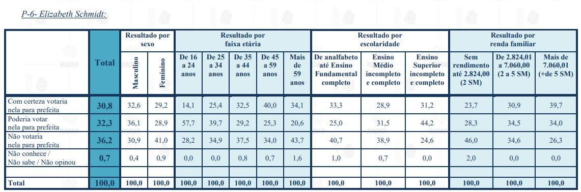 Os eleitores também foram questionados se "com certeza votariam", "poderiam votar" ou "não votariam" em Elizabeth Schmidt. Os resultados por gênero, faixa etária, escolaridade e renda familiar podem ser vistos abaixo: