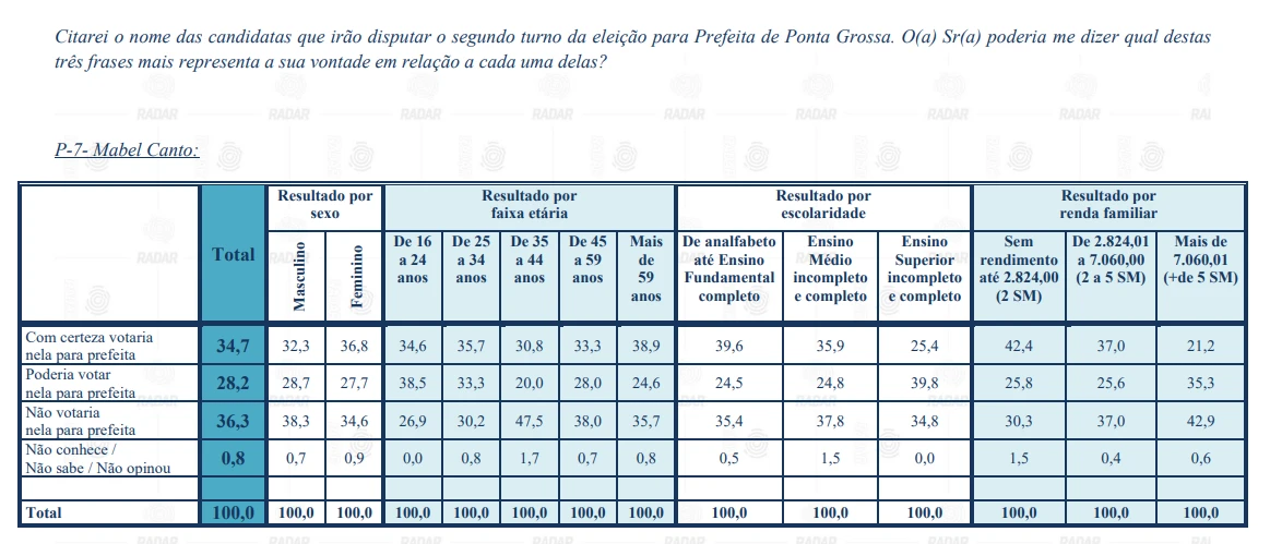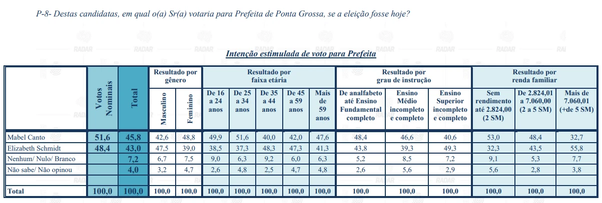 Nesta quarta-feira (23), o Instituto Radar Inteligência divulgou uma pesquisa referente à intenção de votos para o segundo turno em Ponta Grossa. De acordo com as informações coletadas, em um cenário espontâneo (quando não são apresentados os nomes das concorrentes), Mabel Canto lidera com 39,5% das intenções de voto. A atual prefeita, Elizabeth Schmidt obteve 38,3%. Não sabe/não opinou registrou 22,2%.