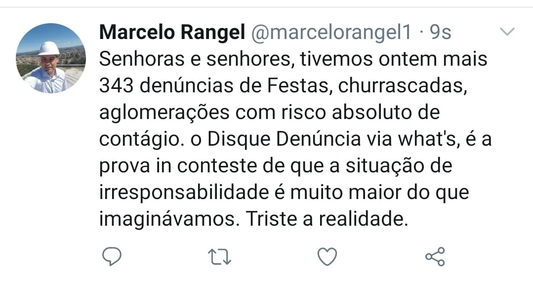 O prefeito de Ponta Grossa, Marcelo Rangel, usou o seu perfil no Twitter para informar, na manhã deste domingo (14), que o disque denúncia da Prefeitura recebeu 343 comunicações de "festas, churrascadas e aglomerações com risco absoluto de contágio" neste sábado (13).