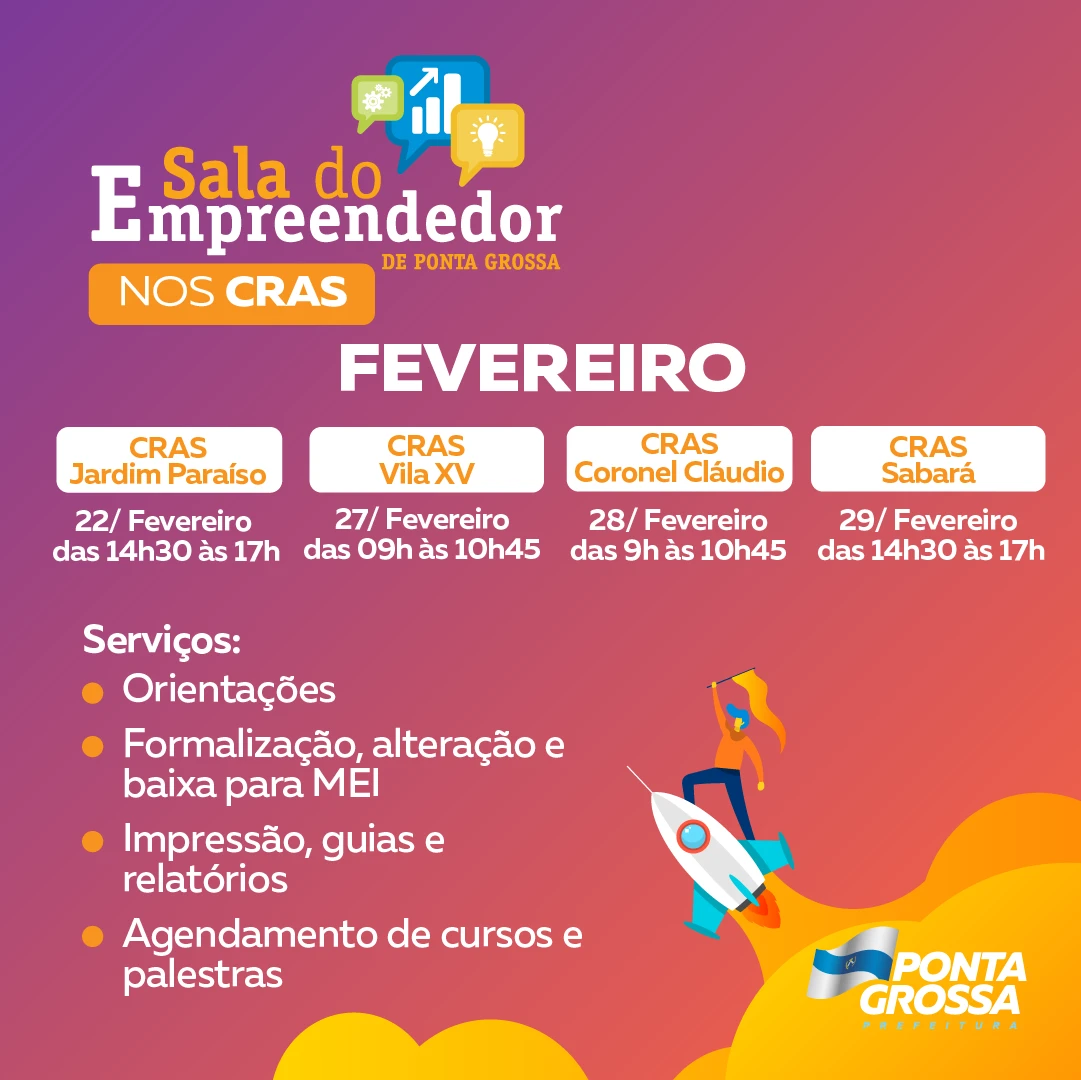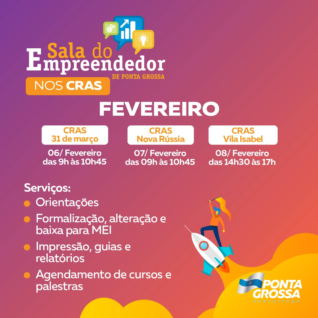 A Sala do Empreendedor retoma os atendimentos nos CRAS a partir de fevereiro. As datas e horários já estão definidos. Entre os serviços oferecidos estão orientações, formalização, alteração e baixa para MEI, impressão de guias e relatórios, além de agendamento de cursos e palestras.