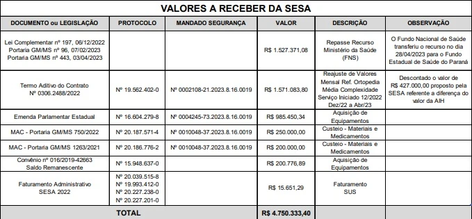 A Secretaria Estadual da Saúde (Sesa) divulgou na tarde desta quinta-feira (04) uma nota à imprensa em resposta ao documento publicado pelo Hospital do Coração Bom Jesus de Ponta Grossa ontem, no qual a instituição afirma que não está recebendo novos pacientes do Sistema Único de Saúde (SUS) para a especialidade de cardiologia clínica e cirúrgica desde as 7h e que teria R$ 4.750.333,40 para receber do órgão estadual. "Não existe condições de tratamento devido ao desabastecimento de materiais, medicamentos e OPME (órteses, próteses e materiais especiais)", pontua a nota.