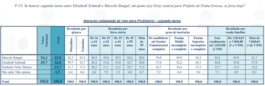 O levantamento do Radar Inteligência divulgado nesta quinta-feira (19) também questionou a intenção de voto dos eleitores em um eventual segundo turno entre Elizabeth Schmidt e Marcelo Rangel. Conforme os dados apresentados, Rangel conquistou 42,8%, enquanto que a atual prefeita registrou 36%. Já nenhum/nulo/branco computaram 14,7% e não sabe/não opinou 6,5%.