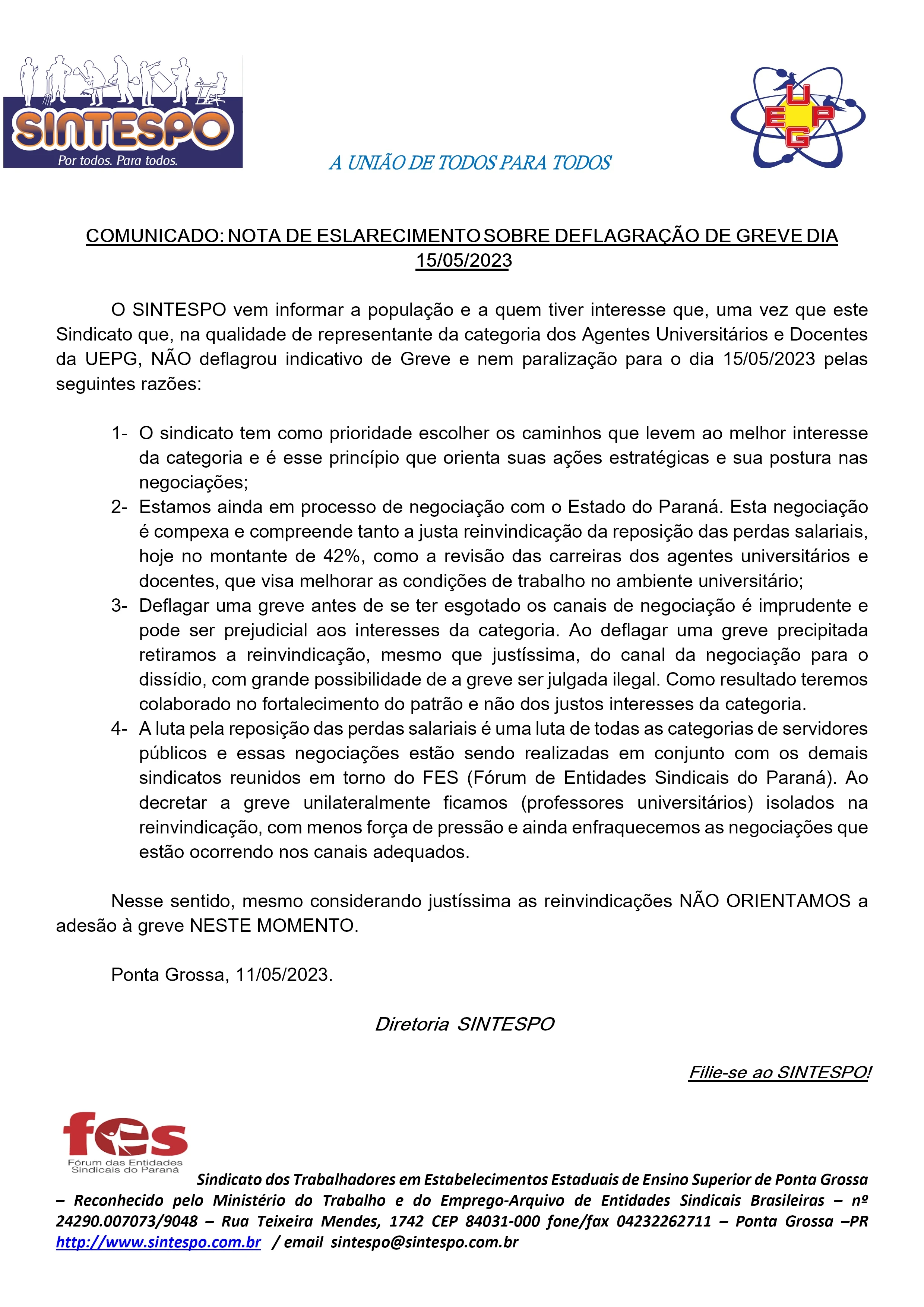 O Sindicato dos Técnicos e Professores da Universidade Estadual de Ponta Grossa (SINTESPO) orienta aos filiados a não aderirem à greve com início definido para a próxima segunda-feira (15), pela Seção Sindical dos Docentes da Universidade Estadual de Ponta Grossa (SINDUEPG).