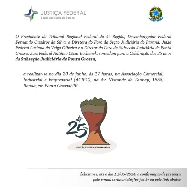 Nesta quinta-feira (20), a Subseção de Ponta Grossa, da Justiça Federal do Paraná, celebrará seus 25 anos em um evento realizado na Associação Comercial, Industrial e Empresarial de Ponta Grossa (ACIPG). A celebração está marcada para às 17h.