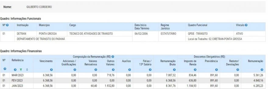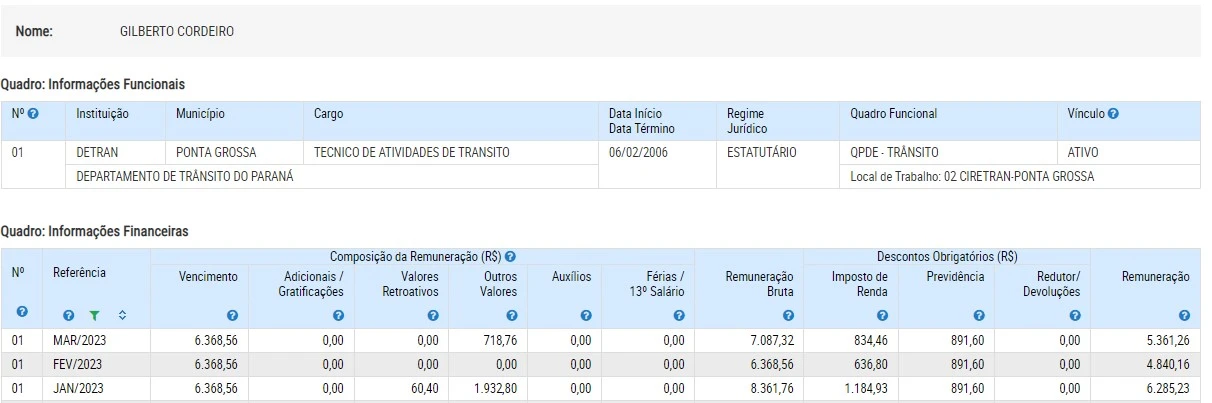 De acordo com o Portal da Transparência do Governo do Paraná, Gilberto Cordeiro ingressou no Departamento de Trânsito do Paraná em 2006, como técnico de atividades de trânsito. No portal, o funcionário consta com vínculo ativo com o Detran, com remuneração bruta de R$ 7.087,32 no mês de março.
