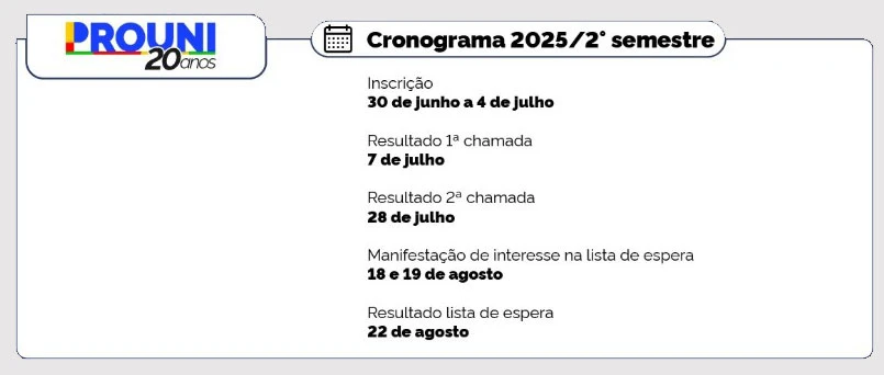 Prouni 20 anos – Criado pelo MEC em 2004, o Programa Universidade para Todos comemora 20 anos de existência em 2025, com mais de 3,5 milhões de estudantes beneficiados entre 2005 e 2025. Desses, 2,5 milhões receberam bolsas de estudo integrais (100%), que tornam a mensalidade do curso gratuita para o estudante. Os demais beneficiados obtiveram bolsa parcial, de 50% do valor da mensalidade do curso. Elas são oferecidas pelo Prouni para cursos de graduação em instituições privadas de todo o país.