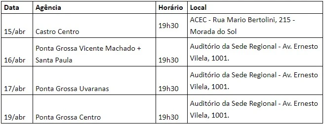 De 15 a 19 de abril, a cooperativa promove assembleia das agências de Ponta Grossa e de Castro