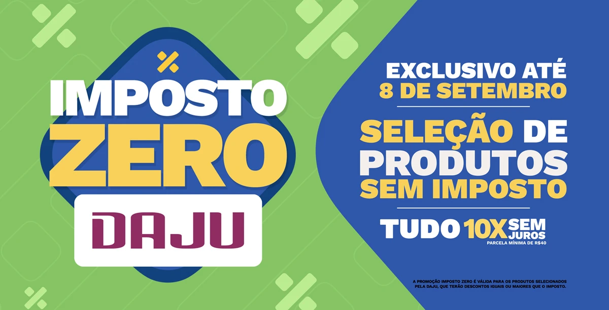 Lembrando que os valores sem imposto são válidos exclusivamente para este final de semana (de 06 a 08 de setembro). A promoção Imposto Zero é válida para os produtos selecionados pela Daju, que terão valores iguais ou maiores que o valor do imposto.