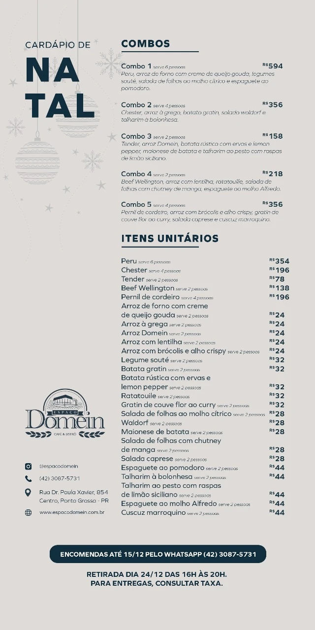 Agora os clientes podem ter o sabor do Espaço Domein Café & Bistrô na sua casa. Um cardápio foi elaborado especialmente para quem deseja mais encanto na ceia de Natal. As encomendas podem ser feitas até o dia 15 de dezembro.