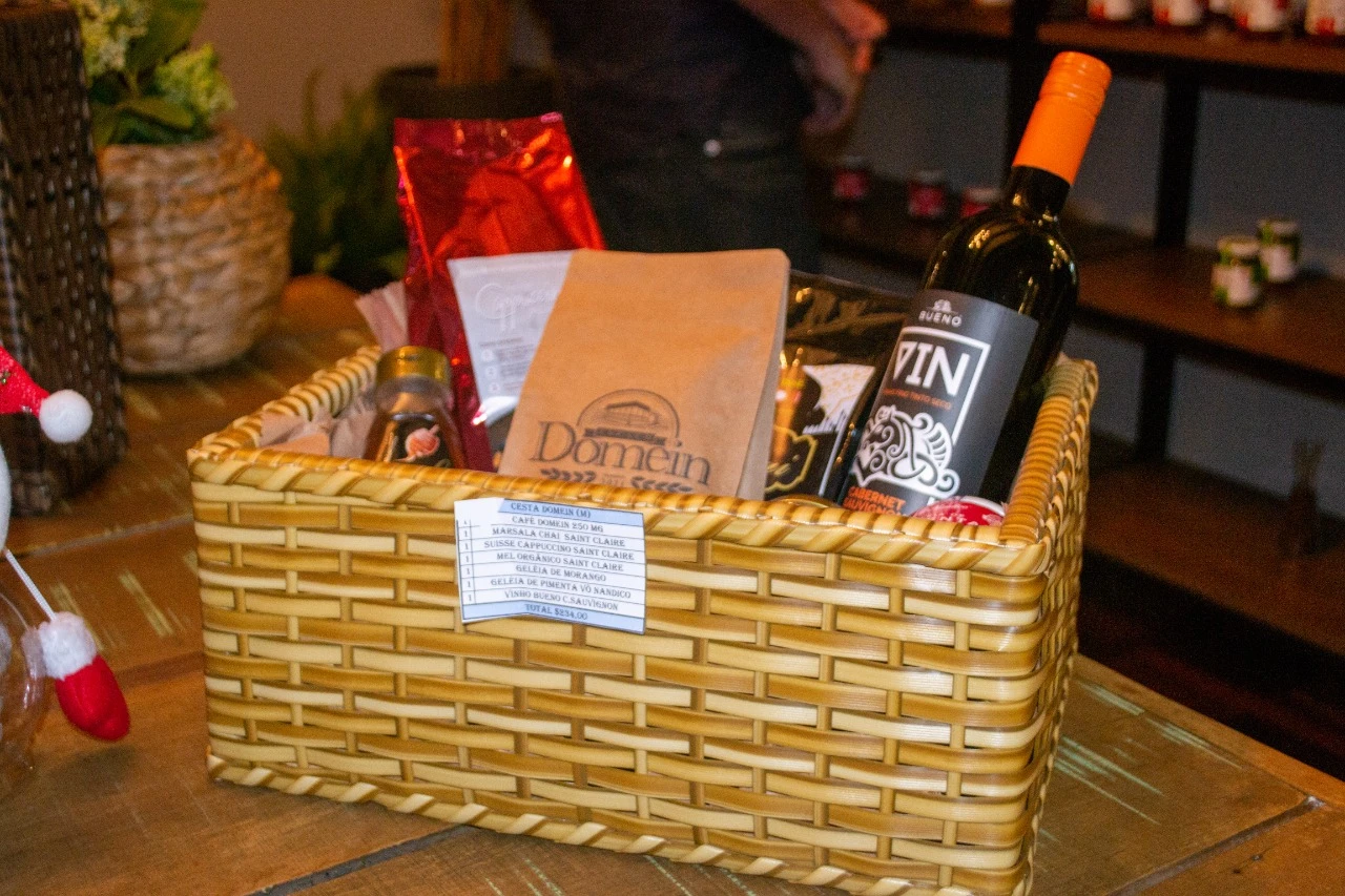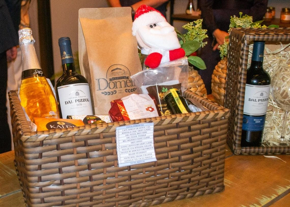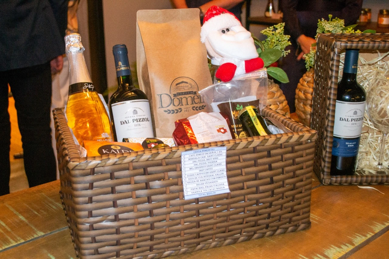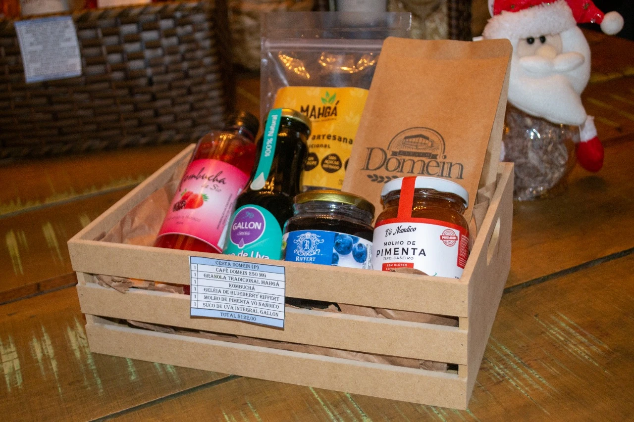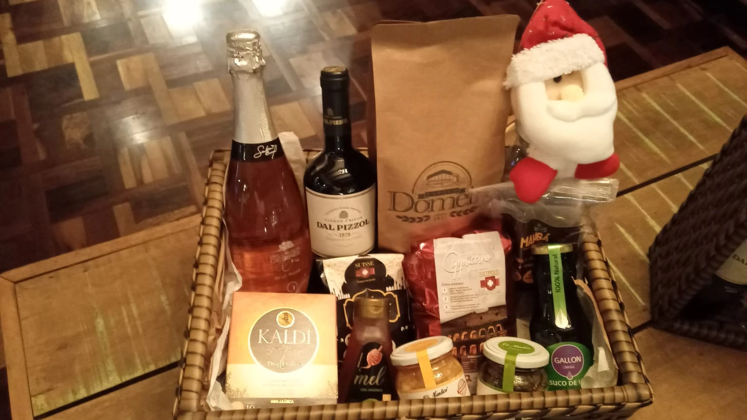 A maior de todas conta com um Café Domein 1kg; marsala chai Saint Claire; um espumante Dal Pizzol Brut Rose; um vinho Dal Pizzol Touriga; mel orgânico Saint Claire; Drip Coffe Kaldi; Suisse Cappuccino Saint Claire; suco de uva integral Gallon; geléia de abacaxi com pimenta; relish Vô Nandico; Papai Noel palha italiana e granola 70% Cacau Mahgá.
