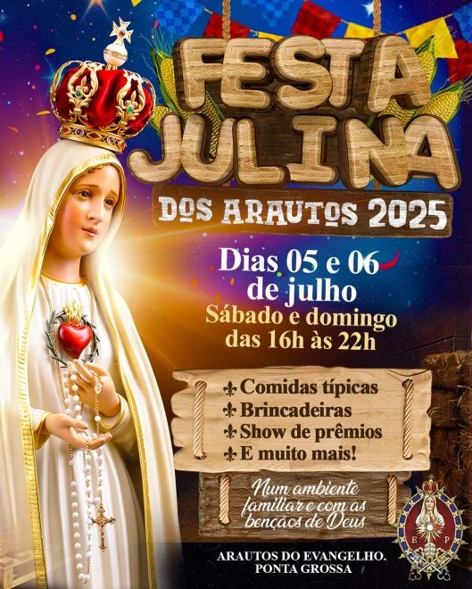 A entrada é aberta à comunidade e a organização destaca que o evento é voltado para toda a família, promovendo valores de união, respeito e alegria. Para quem busca um fim de semana diferente, com muita diversão e tradição, a Festa Julina dos Arautos é uma excelente opção em Ponta Grossa.