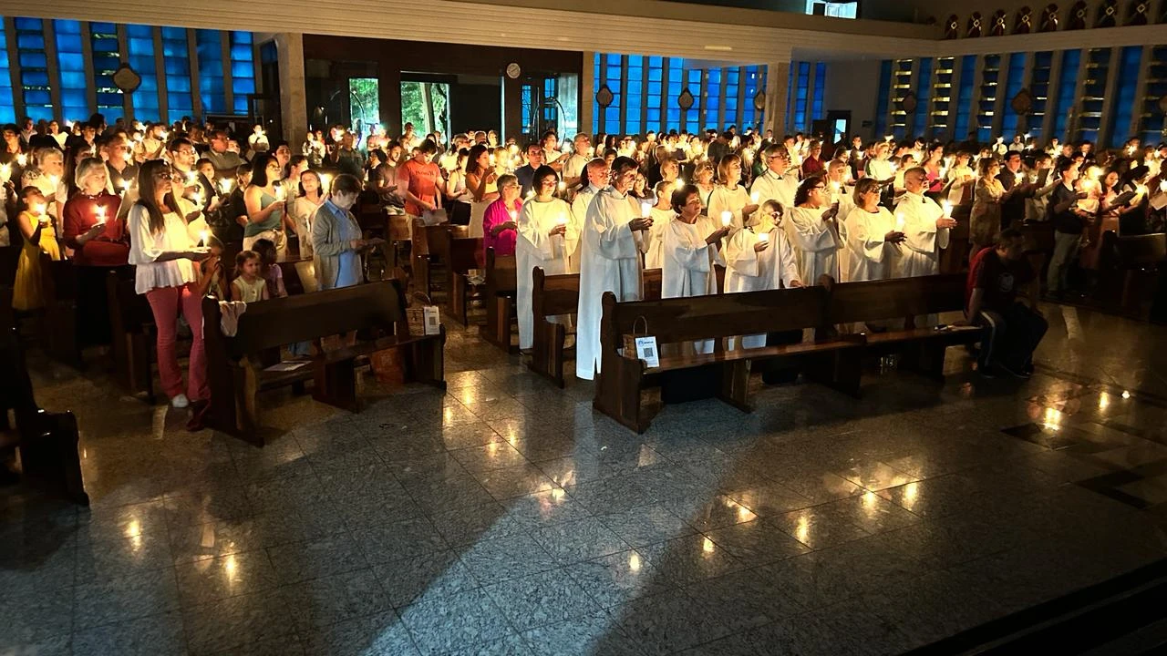 E durante a Vigília Pascal, no último sábado (30), o bispo Dom Sergio Arthur Braschi renovou as promessas batismais de um grupo de 12 pessoas, integrantes do Caminho Neo-Catecumenal da Paróquia Nossa Senhora da Saúde. É a primeira comunidade da Diocese a renovar solenemente as promessas que, como nos tempos da Igreja Primitiva, precisa se dar no Sábado Santo. Padre Carlo César Neri, catequista do Caminho no Paraná Leste e em Santa Catarina, concelebrou com o bispo na Catedral, ao lado de padre Antonio Ivan de Campos e diáconos Dyego Quadros e Pedro Diniz.