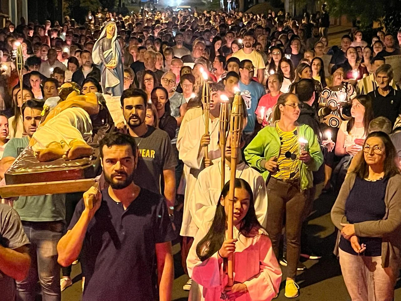 "Na noite da Sexta-Feira Santa, nossa comunidade paroquial Nossa Senhora Medianeira, mais uma vez, se reuniu para fazer a procissão do Senhor Morto e também de Nossa Senhora das Dores. A ocasião reuniu muitas pessoas para uma experiência de fé, oração, encontro e testemunho nos mistérios da morte de Cristo para nossa salvação. Possamos sempre meditar a paixão, morte e ressurreição do Senhor", sugeria o pároco, padre Daniel Farago. A procissão iniciou às 19h30, logo depois de uma meditação das Sete Dores de Maria.
