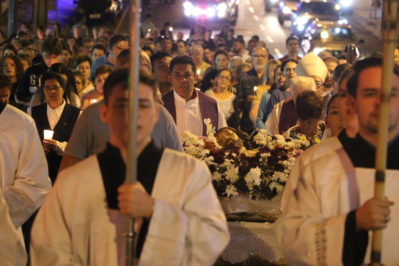 Com velas nas mãos, os fiéis acompanharam a tradicional Procissão do Senhor Morto pelas ruas de Ponta Grossa, na celebração que encerra a Sexta-Feira Santa. Ao manifestar sua fé, os católicos, que já viveram o rito de Adoração à Cruz, no qual beijam e adoram o Cristo Crucificado, se enternecem diante do sacrifício de Jesus por nós. O bispo Dom Sergio celebrou esse momento junto aos paroquianos da Catedral Sant'Ana e da Paróquia Nossa Senhora do Rosário. O esquife com a imagem de Cristo morto saiu da Catedral, às 20 horas, seguindo em direção à igreja do Rosário.