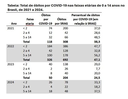 No mesmo período de 2024, foram observadas 48 mortes por Covid-19 entre crianças e adolescentes com menos de 14 anos, representando 32,4% das mortes por SRAG.