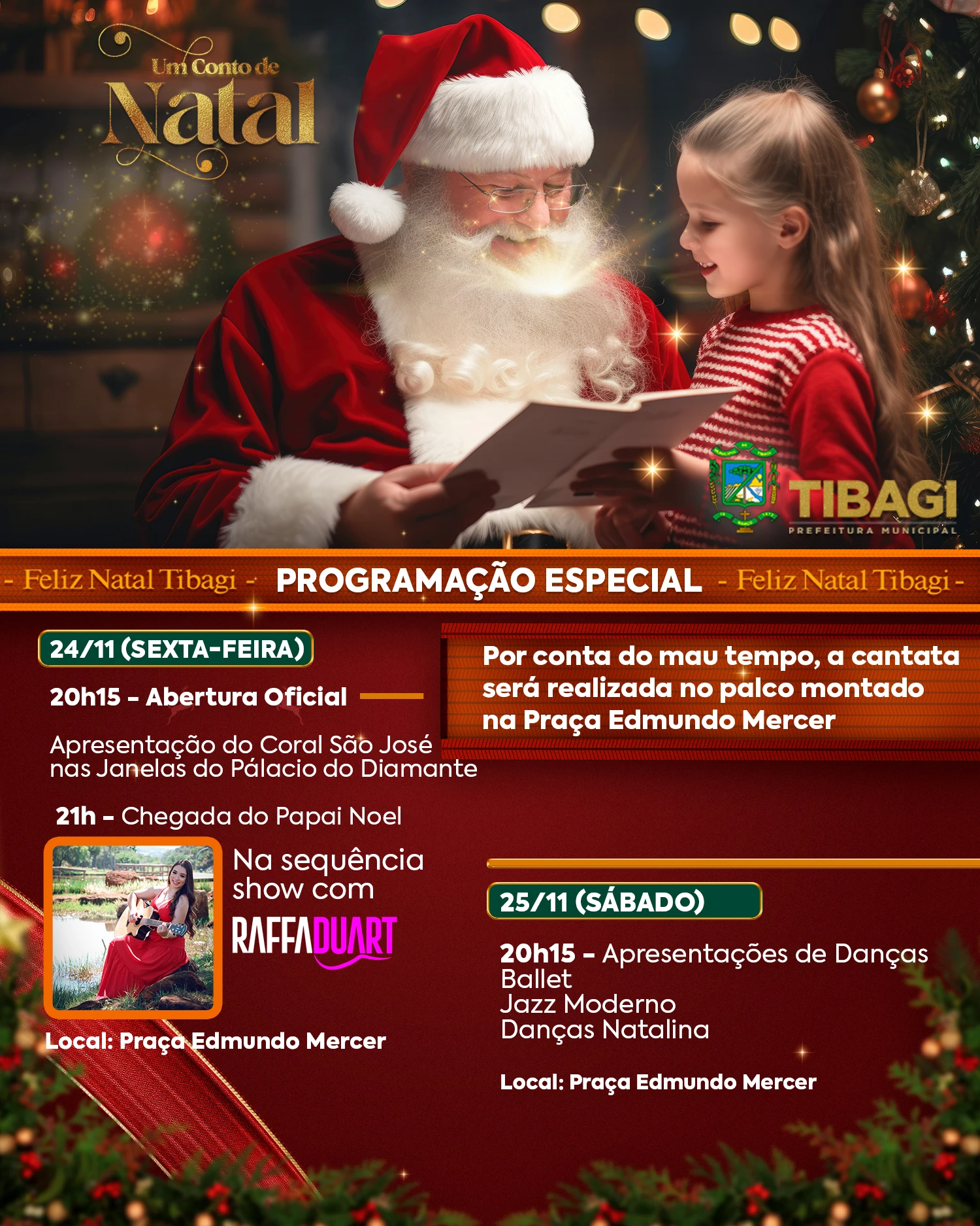 Na noite desta sexta-feira (24), a Prefeitura de Tibagi dá início à programação de natal 2023 a partir das 20h15. Intituladas 'Um Conto de Natal', as apresentações especiais vão até o dia 16 de dezembro, sempre às sextas e sábados.