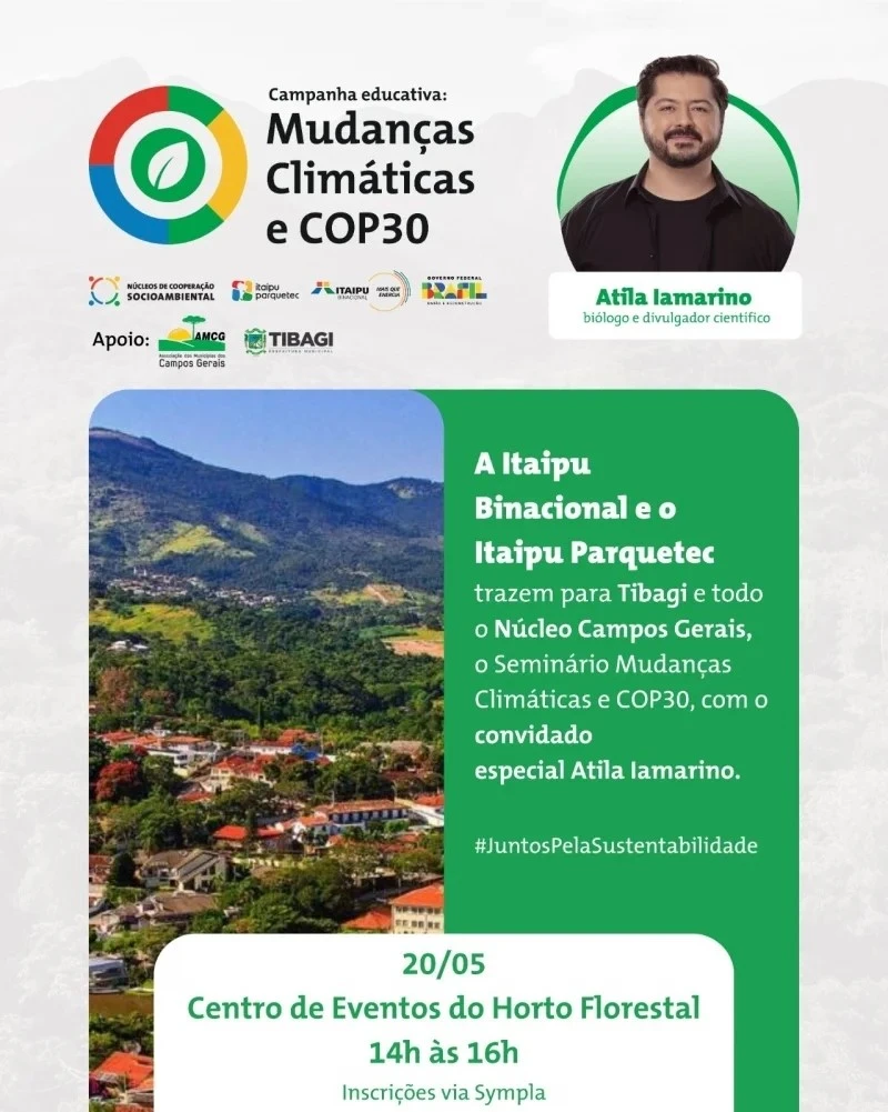 No próximo dia 20 de maio, Tibagi será palco de um grande evento voltado à sustentabilidade e ao enfrentamento da crise climática. O Seminário “Mudanças Climáticas e COP30” será realizado no Centro de Eventos do Horto Florestal, e contará com a presença especial do biólogo e divulgador científico Atila Iamarino, referência nacional no combate à desinformação sobre meio ambiente e saúde pública.