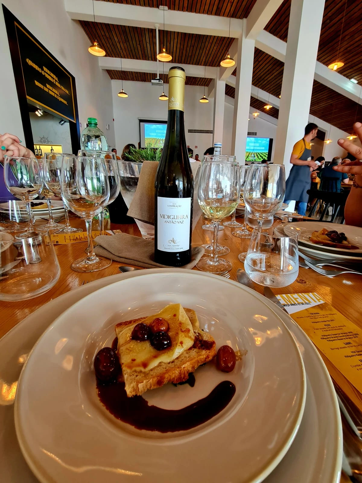 Durante o encontro os convidados foram recepcionados com o Vidigueira Vinho de Talha (branco), elaborado com uvas das castas brancas tradicionais: Antão Vaz, Roupeiro, Manteúdo, Diagalves, Larião e Perrum, algumas delas quase em extinção, na sequência, foram guiados pelo Presidente da Cooperativa, o Engenheiro Agrônomo José Miguel Almeida, pelas dependências da Adega onde foram explicados cada processo realizado pela empresa, na conclusão do tour, a recepção para o almoço foi na elegante Casa de Talhas, uma estrutura anexa preparada para receber convidados, com uma decoração encantadora e onde também se realiza workshops vínicos e provas. No total foram 12 rótulos degustados e harmonizados no almoço servido à francesa e pratos elaborados com produtos locais: