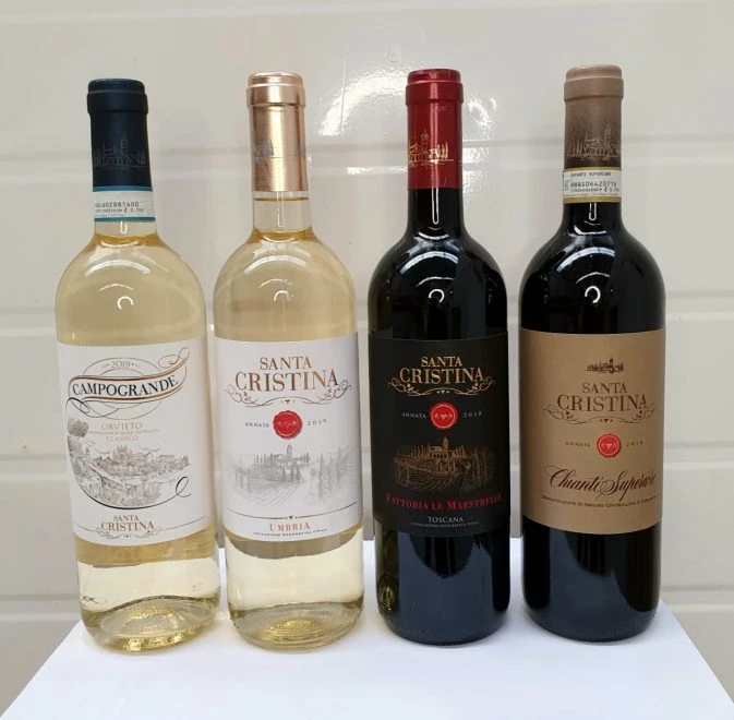 Santa Cristina Chianti Superiore: contém 95% Sangiovese e 5% Merlot, é um vinho equilibrado, com muita fruta e uma leve nota de carvalho, que lhe confere mais estrutura e personalidade. Ideal com antepastos, massas com molho vermelho e assados.